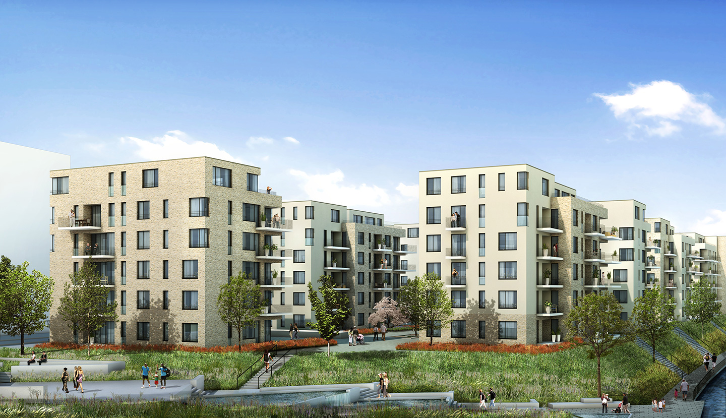 Ein zentrales Baufeld wird durch die Rhein-Main Wohnwerte GmbH, Heidelberg, als Wohnquartier mit rd. 150 Eigentumswohnungen entwickelt. Das städtebauliche Konzept orientiert sich an der einmaligen Wasserlage des Grundstücks und positioniert die solitären Wohngebäude mit möglichst optimalem Blick zum Wasser.