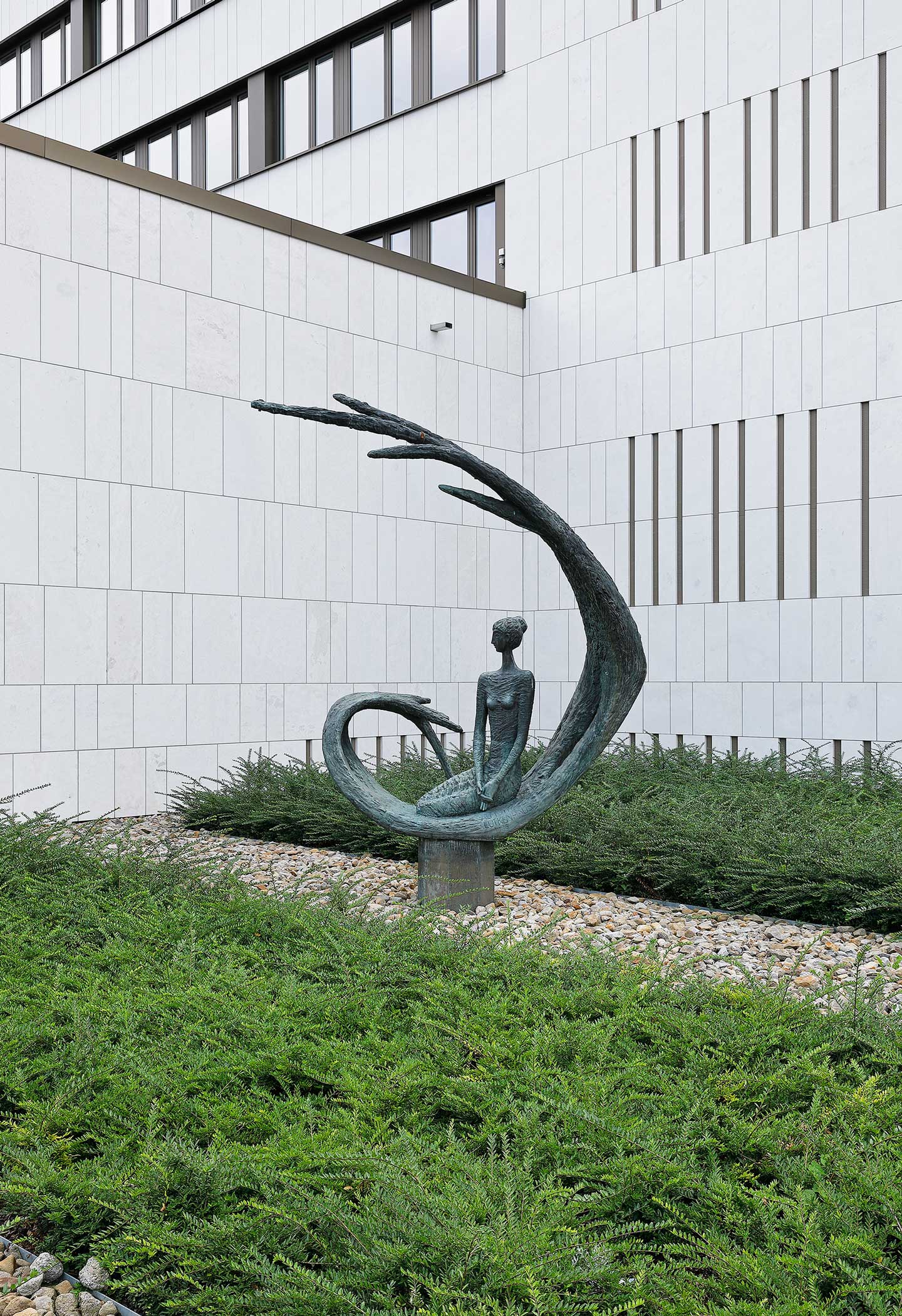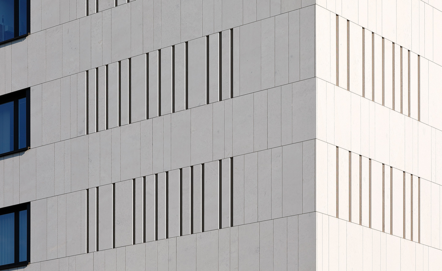 Der verwendete Kalkstein wurde, nicht zuletzt auch unter Würdigung von denkmalgeschützten Objekten in Sichtweite der Geschäftsstelle, ausgewählt. Darauf abgestimmt wurden sämtliche Aluminiumelemente der Fassade mittelbronze eloxiert.