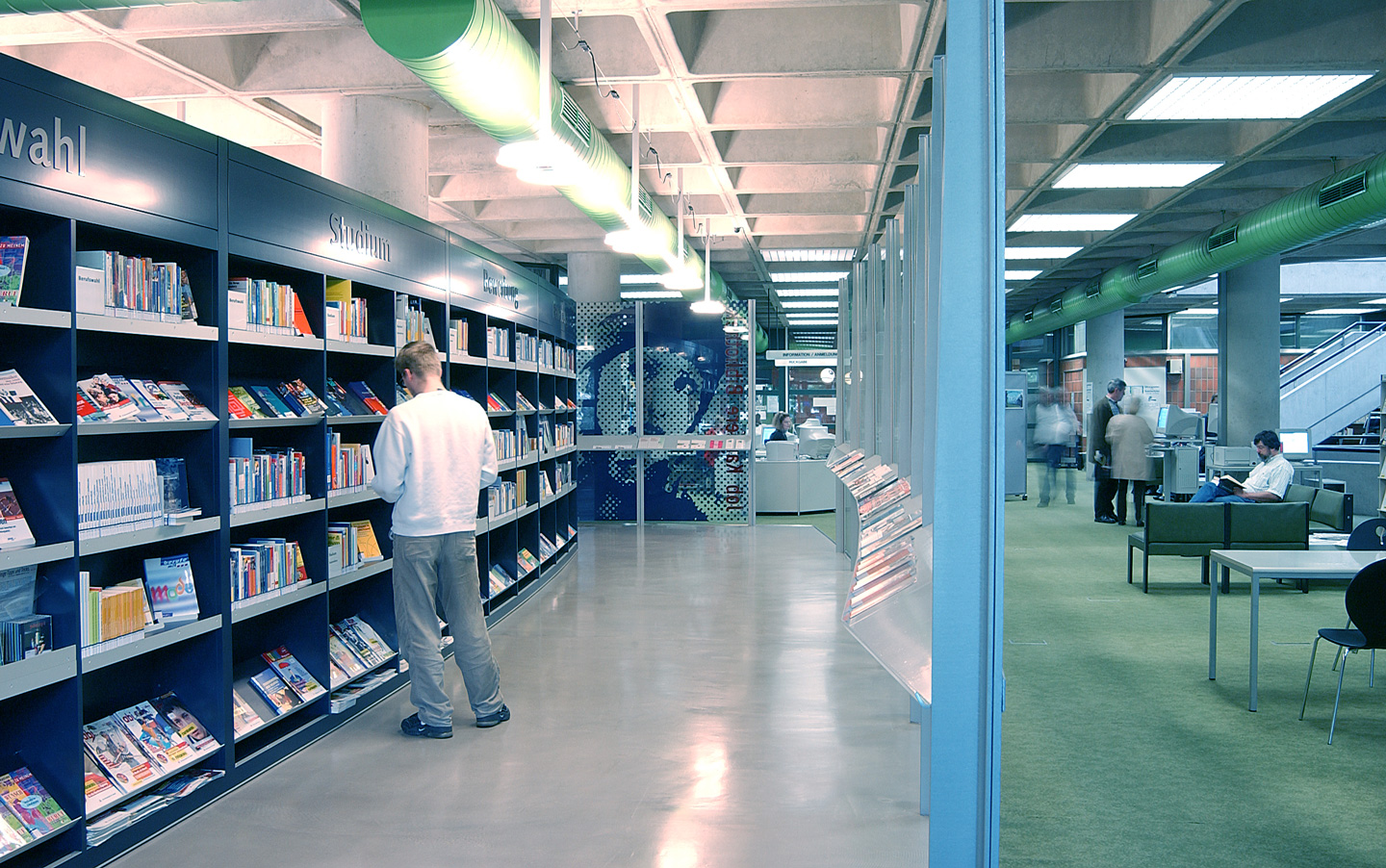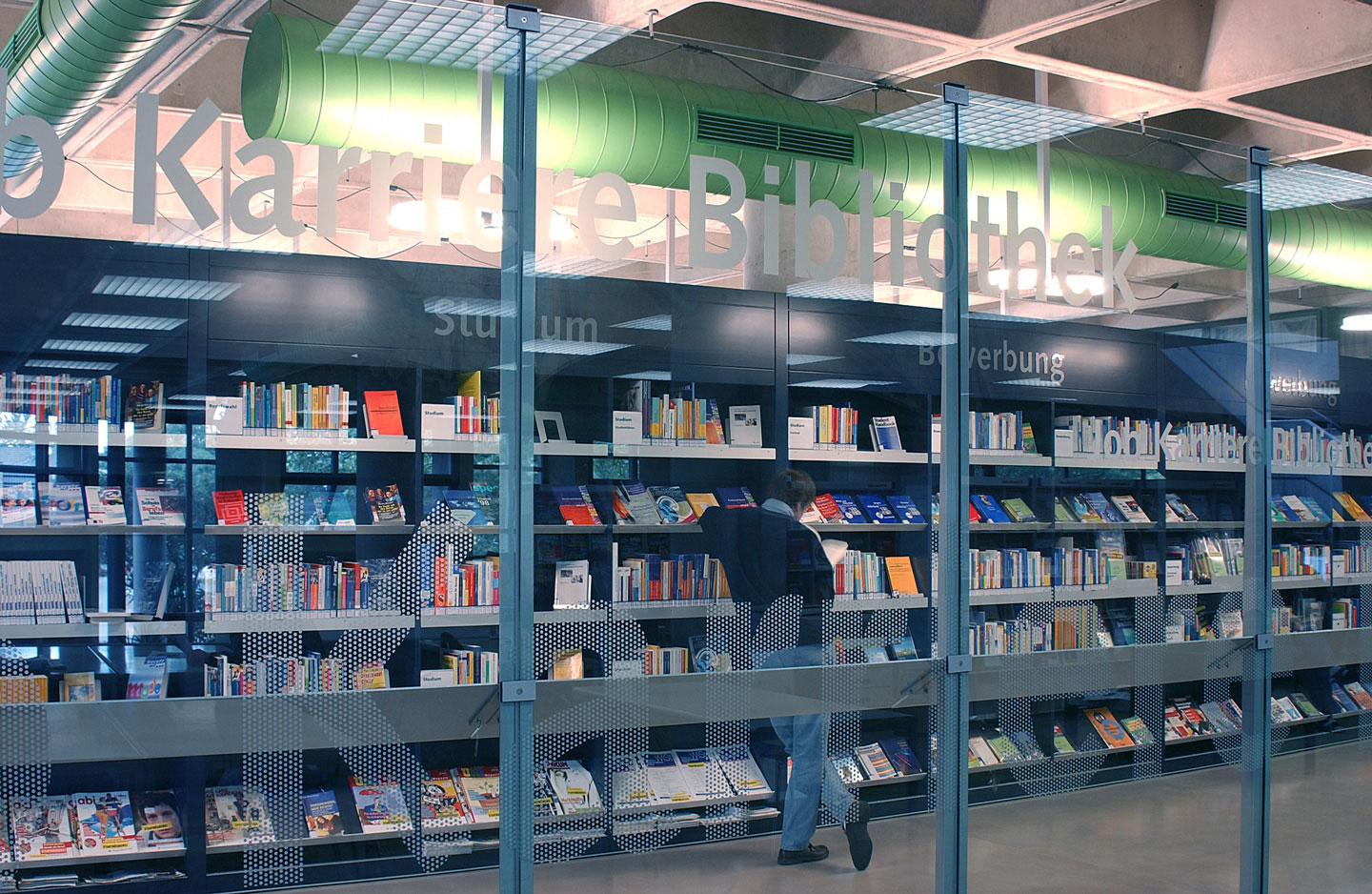 Die Job-Karriere-Bibliothek dient damit zugleich als erster Baustein in einem wünschenswerten neuen Gesamtkonzept für die Bücherei, das der individuellen Gestaltung einzelner Themenbereiche besondere Bedeutung beimisst. Priorität gewinnt die Aufenthaltsqualität für die Besucher, die die Bücherei bei höchster Funktionalität und angenehmer Atmosphäre als einen modernen Ort des Lesens, des Wissens und des Austauschs erfahren.