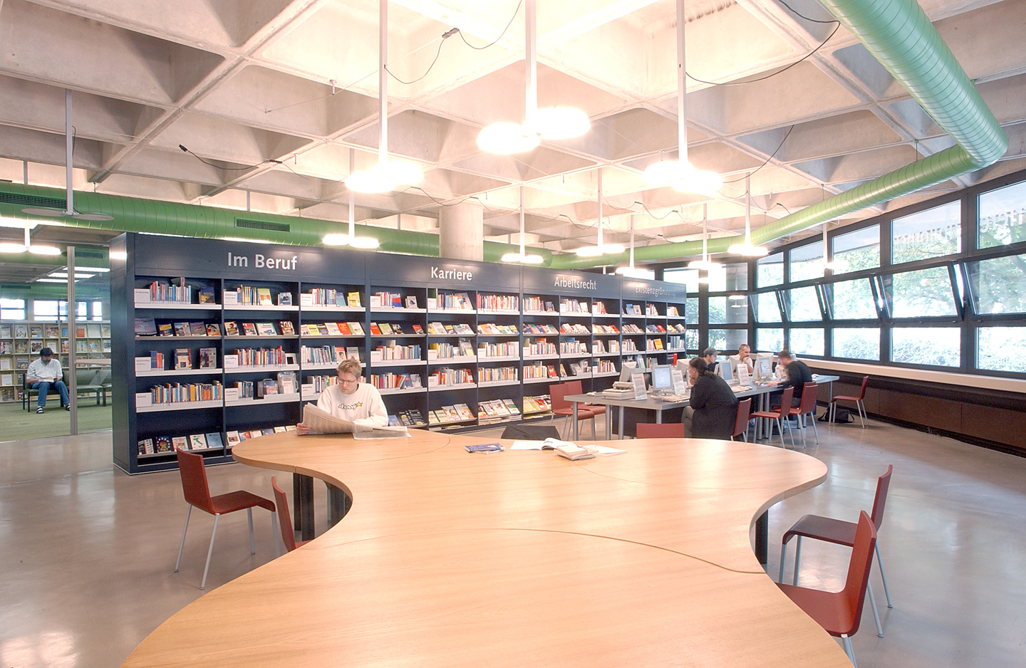 Aufgrund einer Initiative der Bertelsmann Stiftung entstand in der Stadtbücherei Bochum die sogenannte "Job-Karriere-Bibliothek". Innerhalb der wichtigen städtischen Einrichtung hat die von Rübsamen Partner entworfene neue Bibliothek einen funktional wie gestalterisch bewusst eigenständigen Charakter. Als offene, transparente Zone lädt sie nicht nur zum Stöbern und Lesen, sondern auch zu Gesprächen in kleiner Runde ein. Die alte Aufteilung mit Einzelregalen wurde aufgelöst und ein zentrales Regal als raumdefinierendes Element eingeführt. Gemeinsam mit den Arbeitsplätzen und dem Lesetisch formuliert es eine Raumfigur, die der Bibliothek eine freundliche, offene und zweckmäßige Identität verleiht.