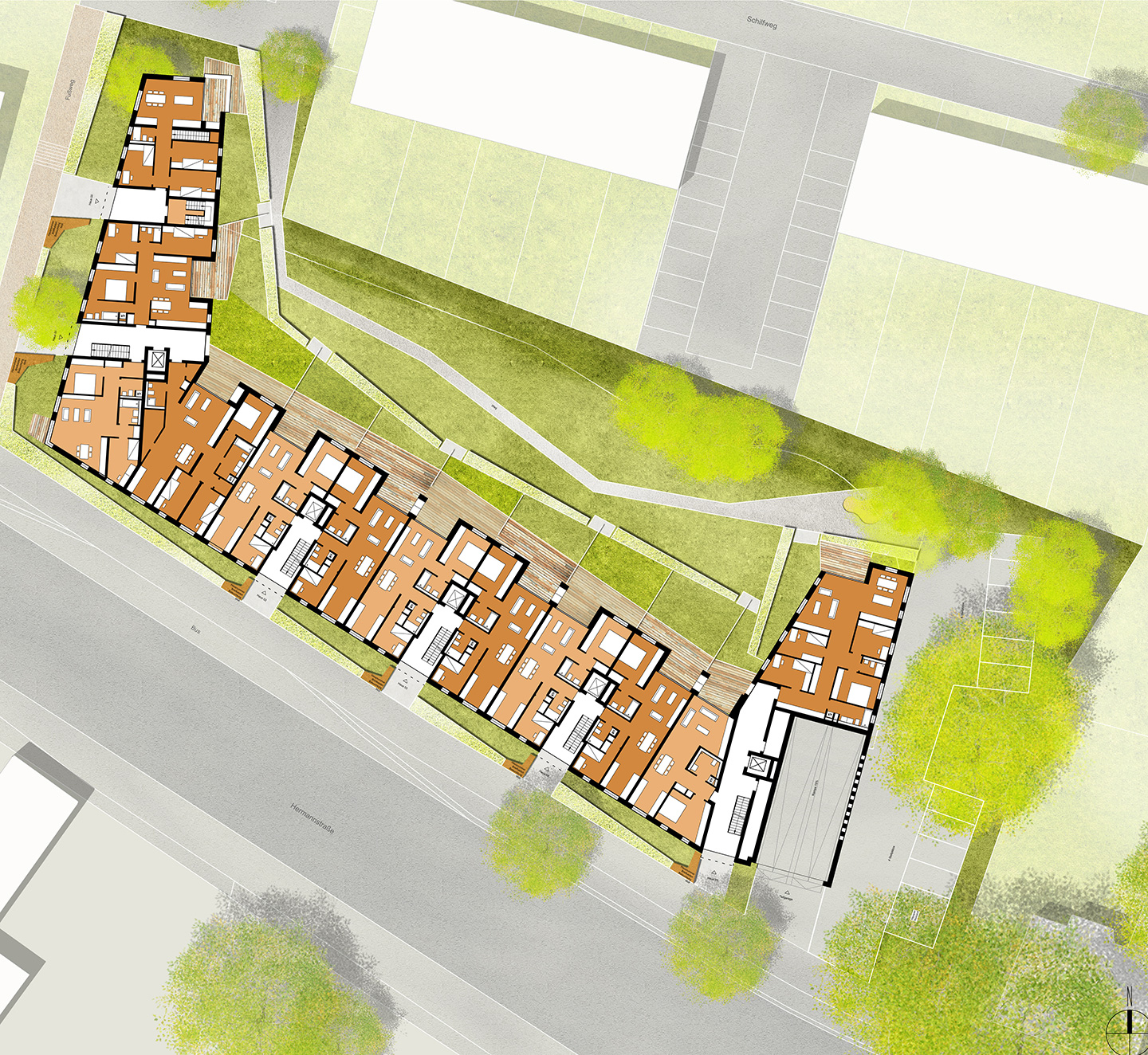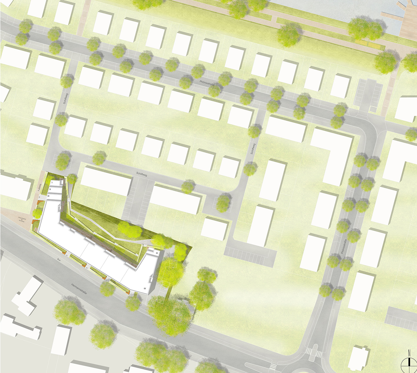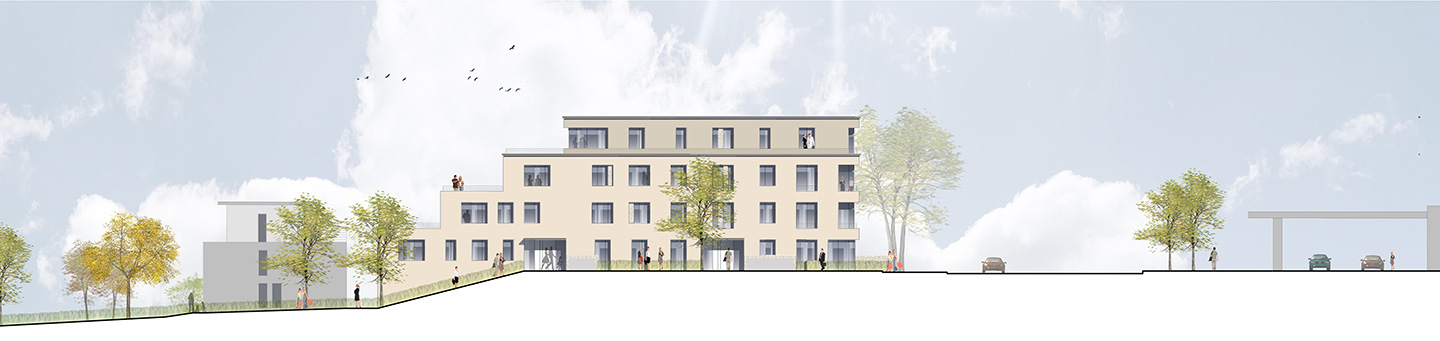 Dezidiert urban verstandene Stadtumbaumaßnahmen wie das Projekt Phönixsee schaffen Orte mit vielfältigem städtischem Leben. Als zentrales Stadtentwicklungsprojekt bündelt der Phönixsee unter dem Motto “Wohnen, Arbeiten und Erleben am Wasser” verschiedene Teilprojekte, die von der Attraktivität innerstädtischer Wasserflächen profitieren. Der hier vorgelegte Entwurf liegt in bester Sichtbeziehung leicht erhöht über dem Phönixsee und schafft auf rd. 0,5 ha Grundstücksfläche rd. 6.000 m² BGF und rd. 5.000 m² Wohnfläche. Die Insgesamt 6 Häuser weisen auf 4 Geschossen 49 Mietwohnungen nach, die auf einer gemeinsamen Tiefgarage errichtet sind.