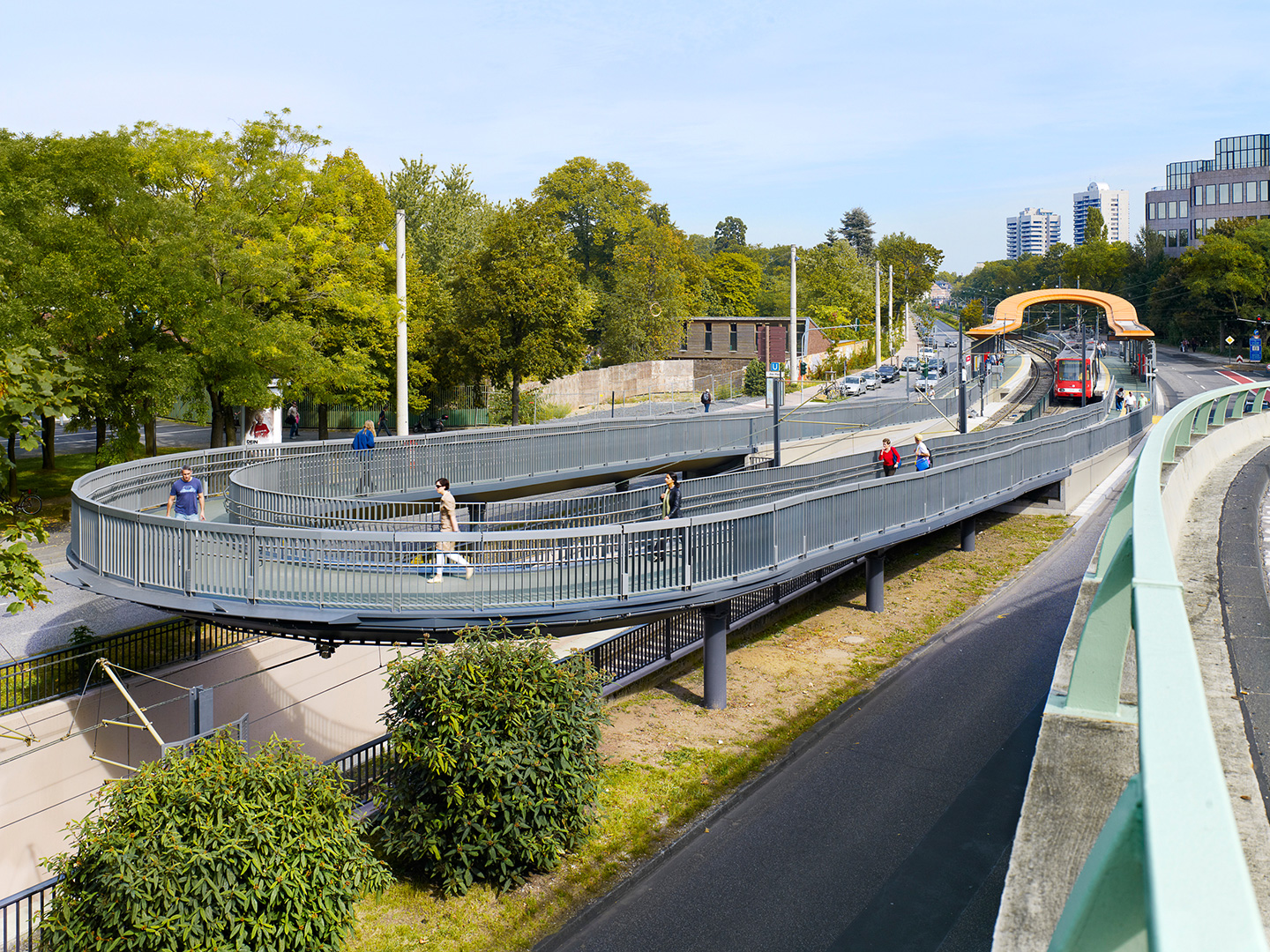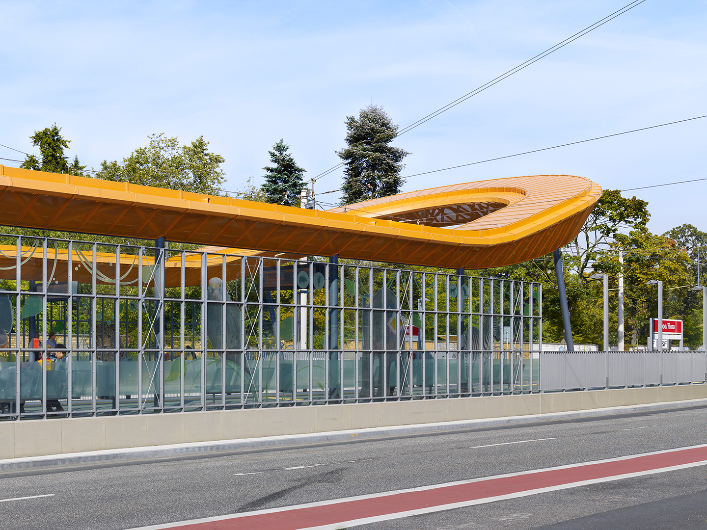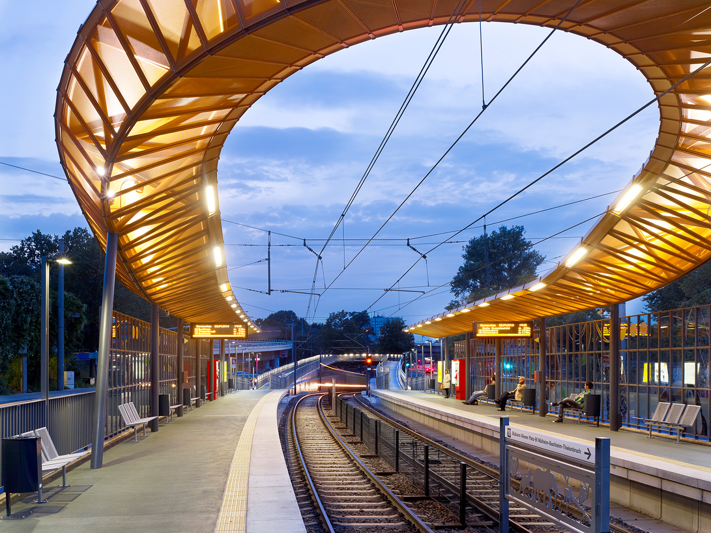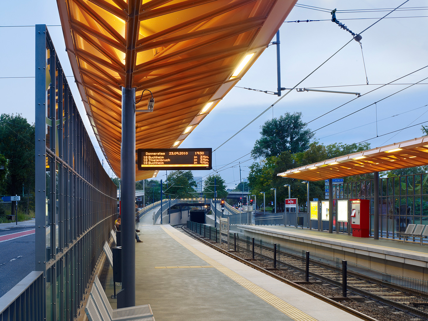 Die große Form und die rationale Sprache, die sich bis in Details wie Geländer und Tragwerk fortsetzt, verleihen der Haltestelle Zeichencharakter, der abends durch ein zurückhaltendes Lichtszenario der beiden prägenden Elemente betont wird. Realisiert wurde somit nicht nur ein Stück funktionaler Infrastruktur, sondern - entwickelt aus konstruktiver Logik - dessen Transformation zum städtischen Ort.