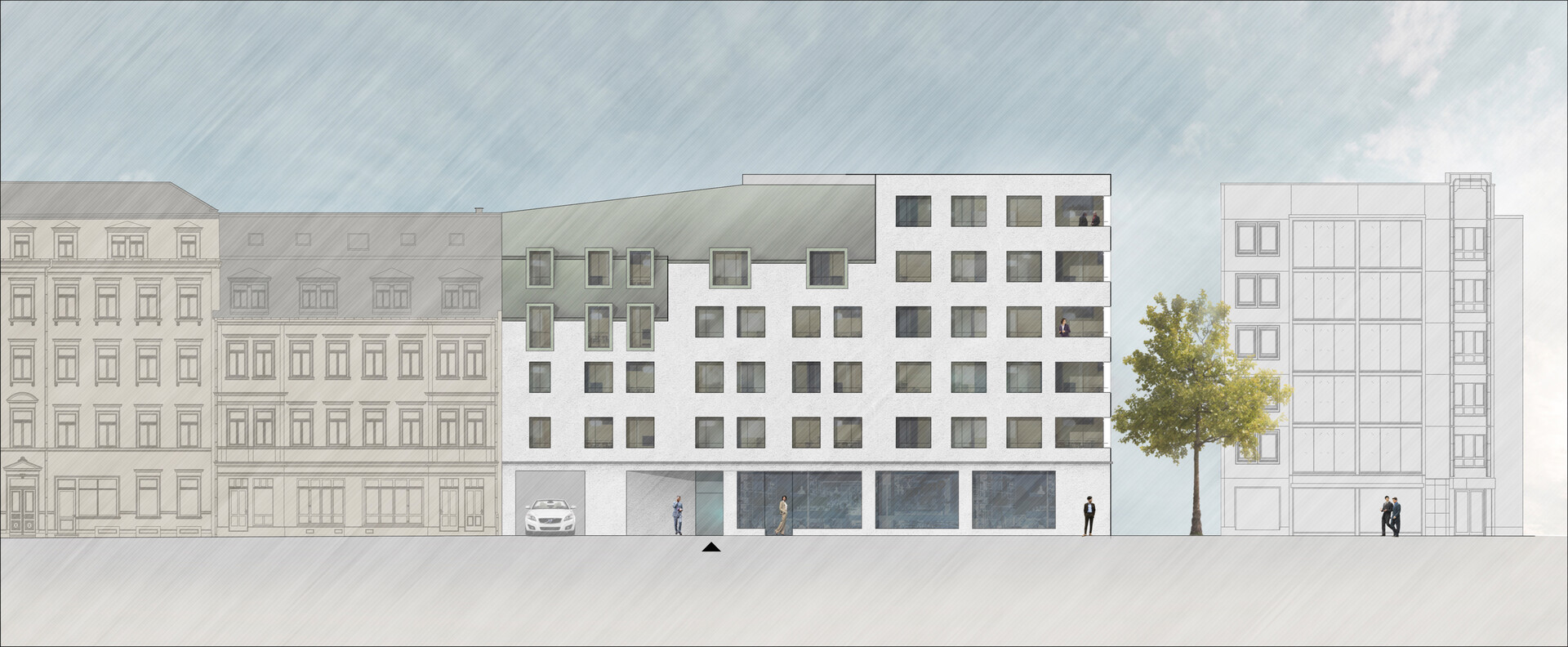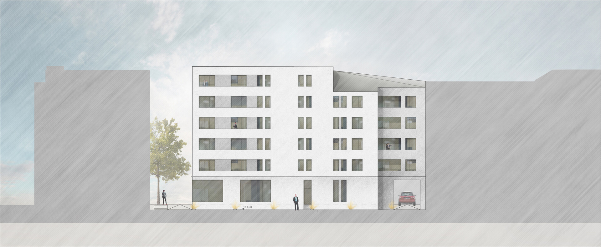 sinnvollen Weiterbauens berührt. Der Wettbewerbsentwurf für ein Wohngebäude mit Geschäftsnutzung im EG