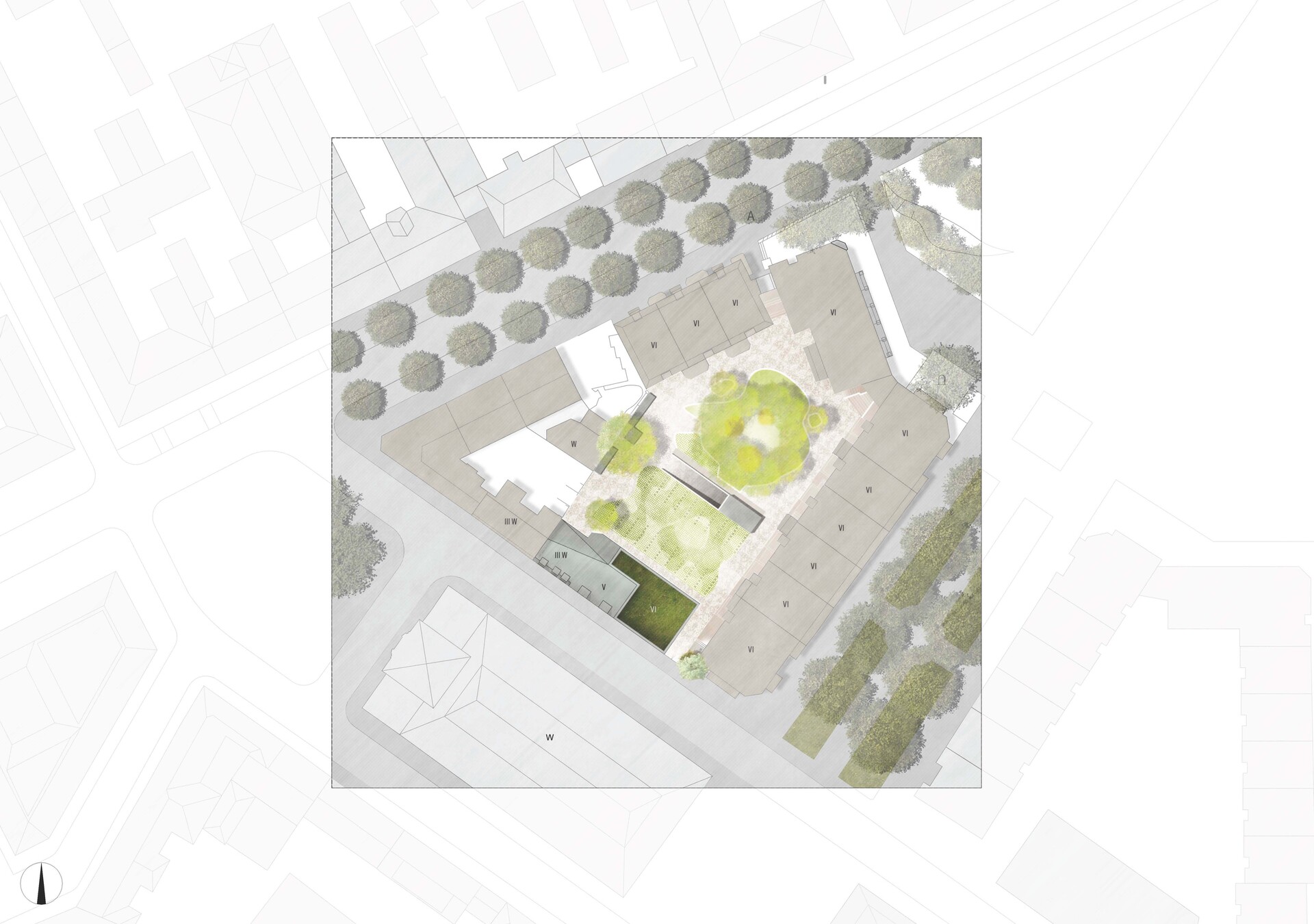 Auf der anderen Seite hält er Abstand von der Nachkriegsbebauung, um deren Charakter als Zeitzeuge zu