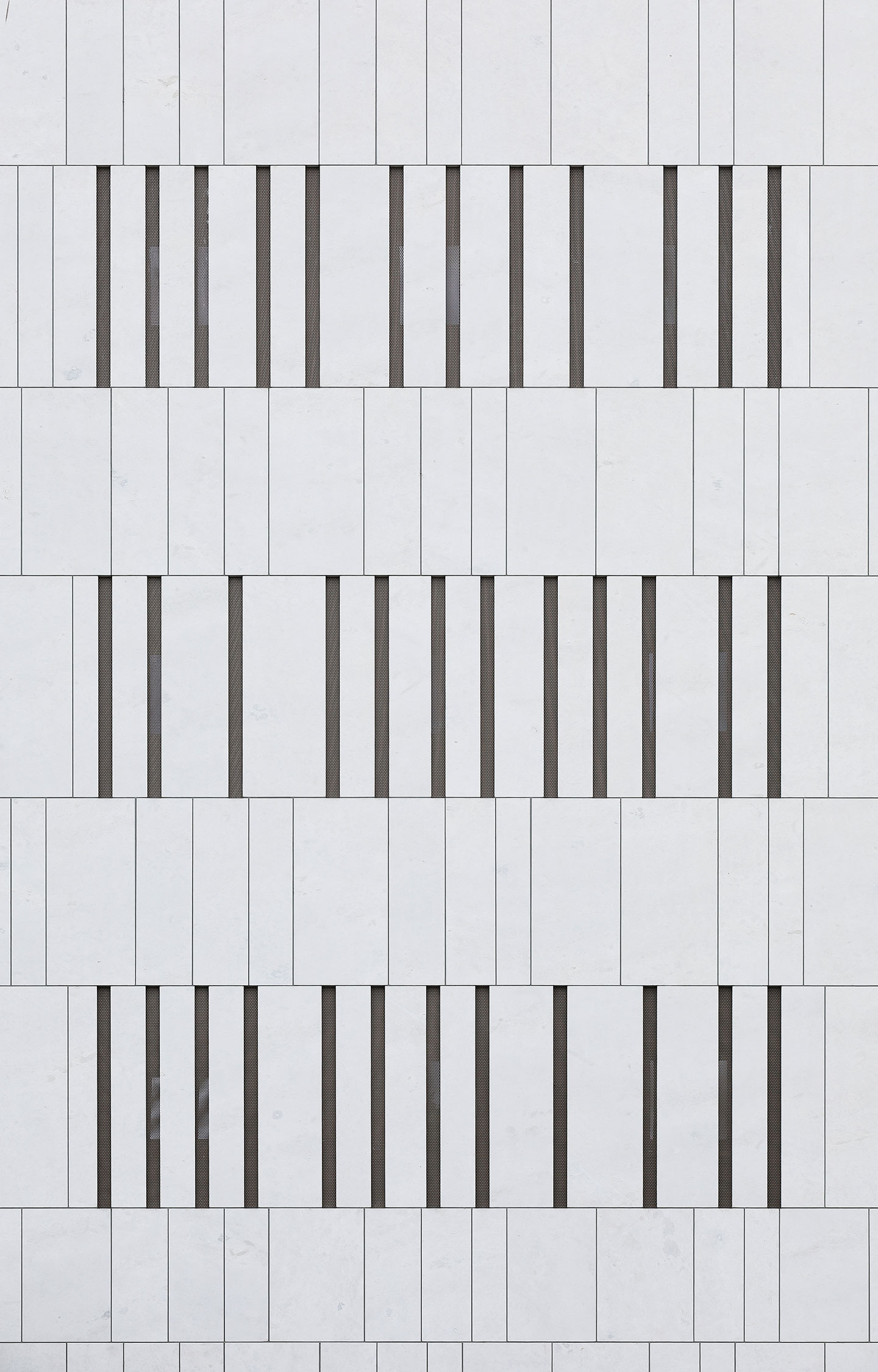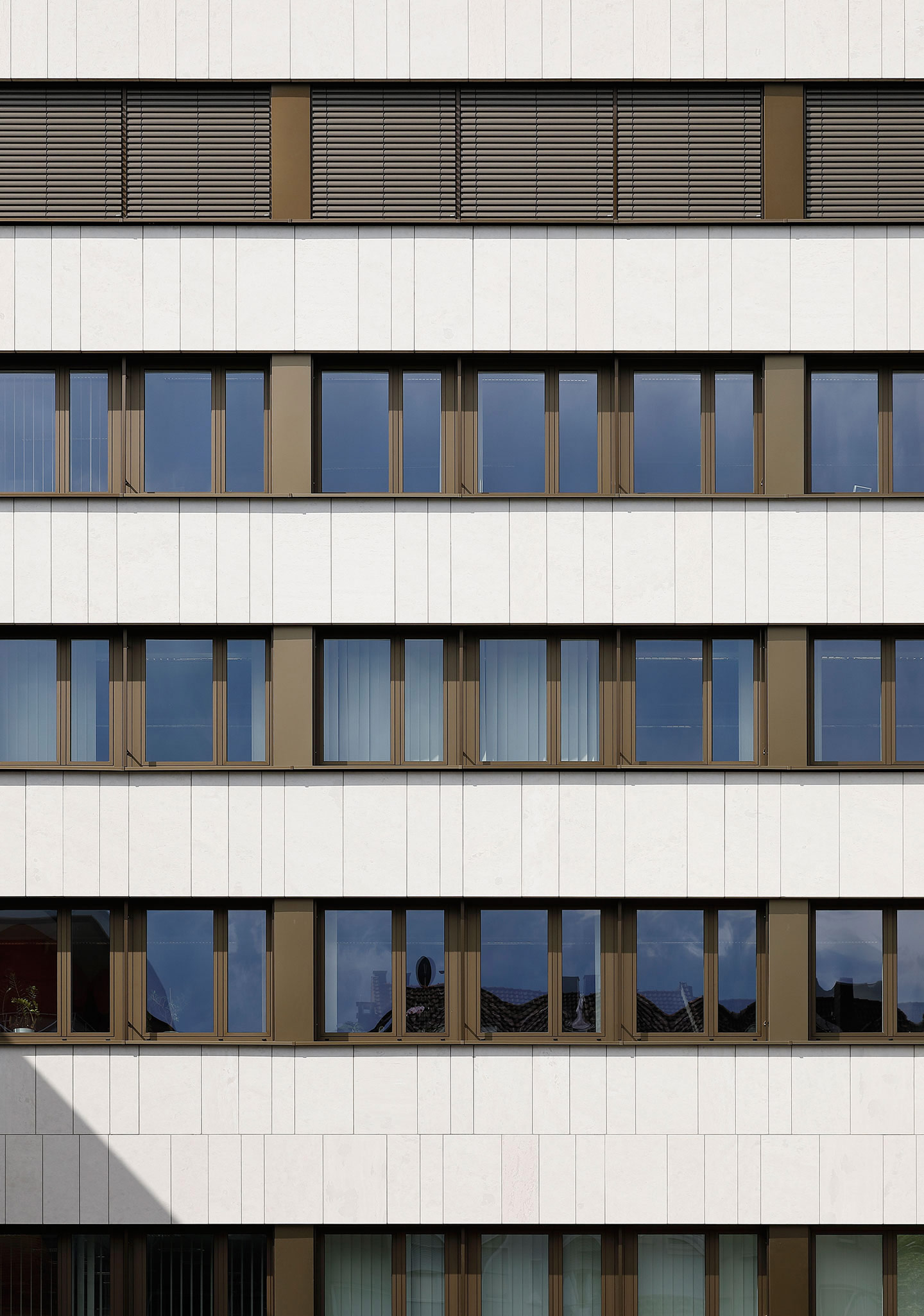 Der verwendete Kalkstein wurde, nicht zuletzt auch unter Würdigung von denkmalgeschützten Objekten in Sichtweite der Geschäftsstelle, ausgewählt. Darauf abgestimmt wurden sämtliche Aluminiumelemente der Fassade mittelbronze eloxiert.