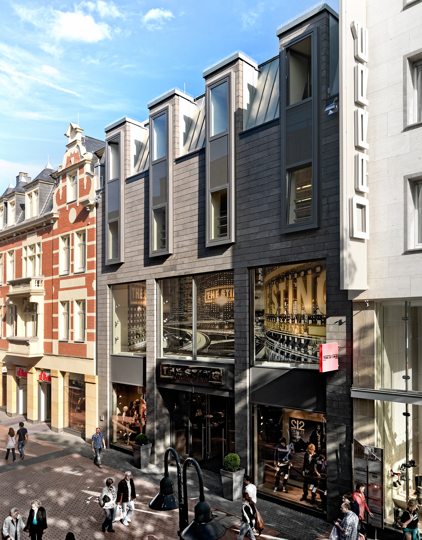 Die beiden Geschäftshäuser Seltersweg in Gießen, im Jahr 2009 von Rübsamen Partner für einen international agierenden Projektentwickler realisiert, sind für die Verknüpfung dieser Herausforderungen bestes Beispiel. Mitten in der Gießener Fußgängerzone galt es zum einen, ein denkmalgeschütztes Geschäftshaus den heutigen Wünschen einer renommierten Modekette anzupassen. Rübsamen Partner öffnete das Innere zu einer einladenden Ladenfläche und führte gleichzeitig das Äußere auf seine ursprüngliche, den Ort prägende Erscheinung zurück. Zum anderen wurde auf der Nachbarparzelle ein Neubau in einer reduziert-klaren, die Struktur der historischen Vorbilder respektierenden Sprache errichtet. Mit dem niederländischen Multilabel-Filialisten The Sting wurde auch hier ein höchst erfolgreicher Nutzer gewonnen. Beide Bauten beinhalten in den oberen Geschossen Verkaufs- sowie Verwaltungsräume und schreiben so mit einer Gesamtfläche von mehr als 4.000 Quadratmetern die wichtige Sicherung attraktiver innerstädtischer Nutzungen als Grundlage künftiger City-Entwicklung fort.