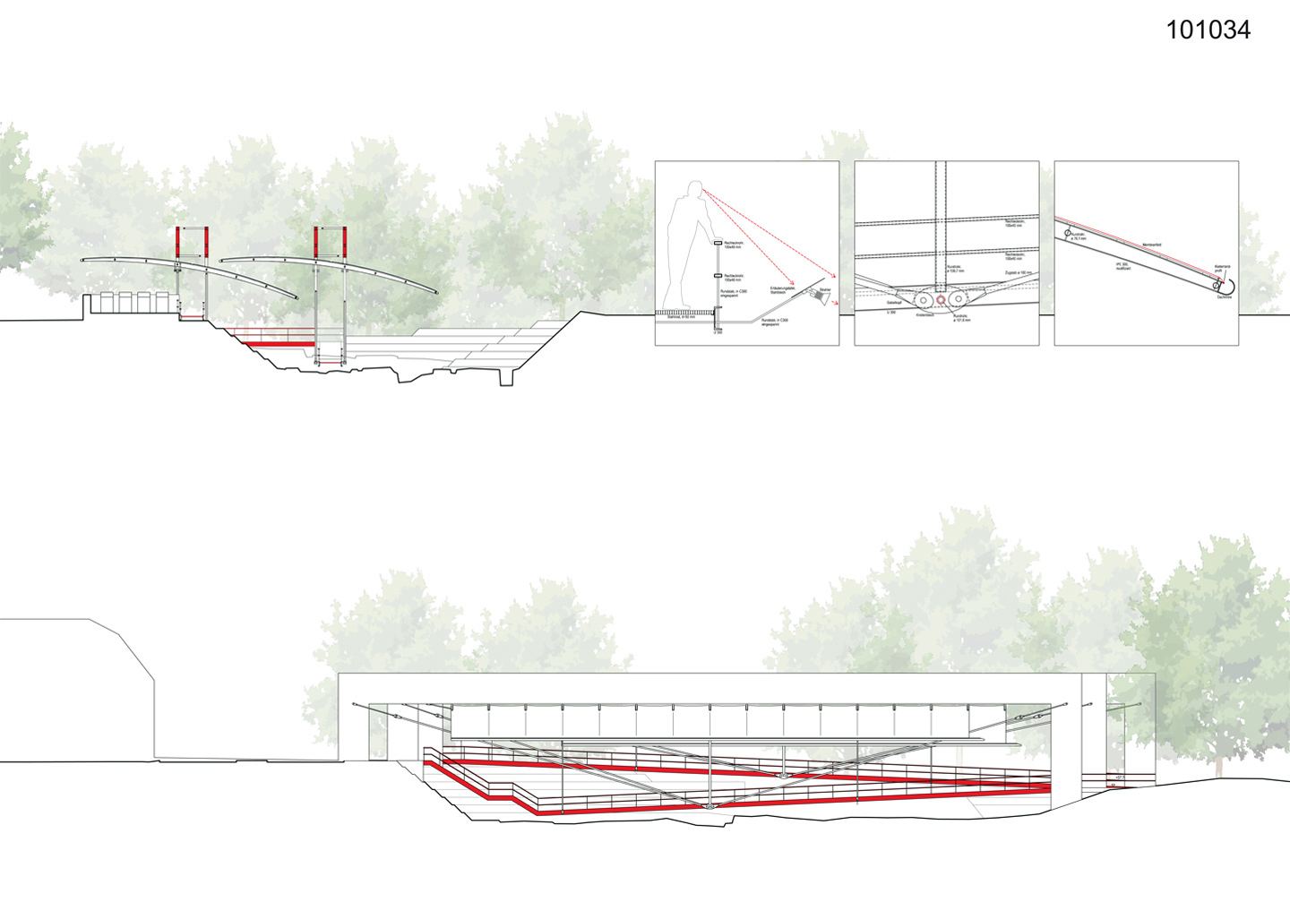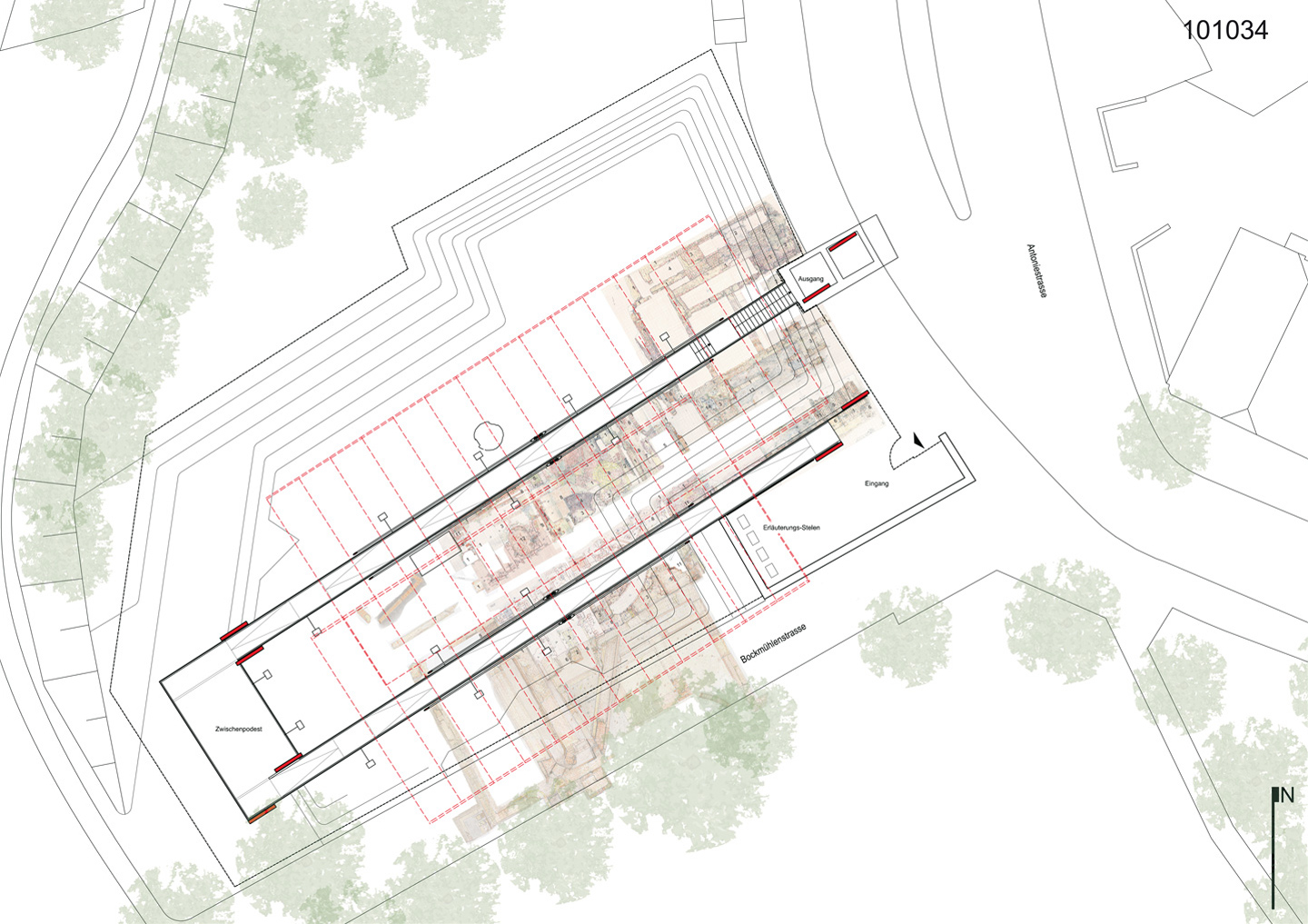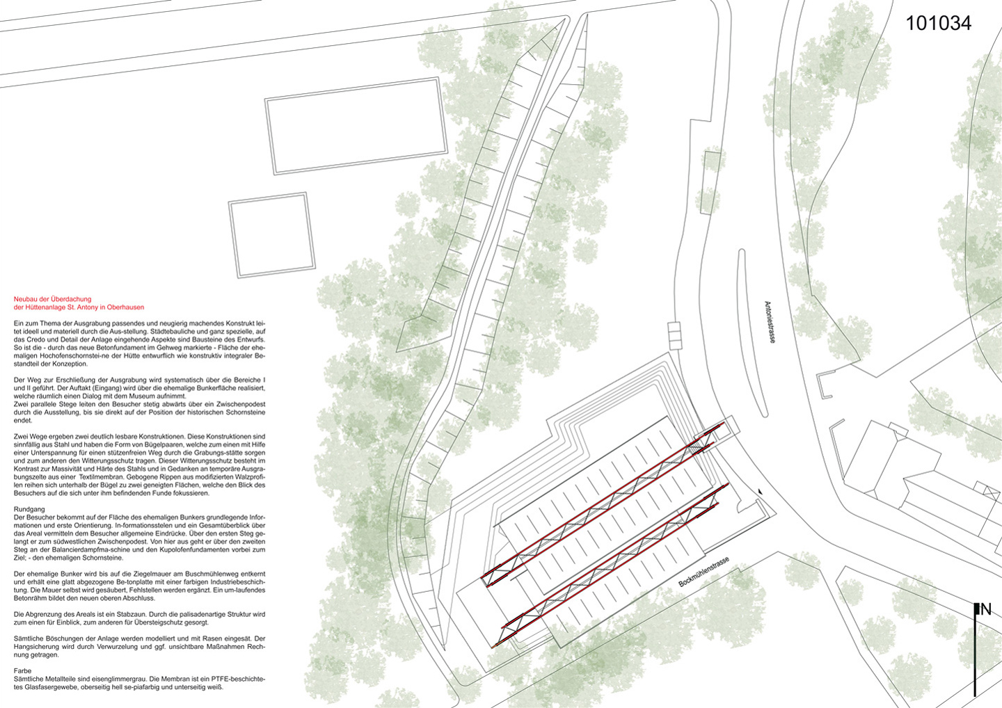 Die St. Antony-Hütte in Oberhausen ist die Geburtsstätte der Ruhrindustrie und Keimzelle des Weltkonzerns Gutehoffnungshütte: 1758 floss hier erstmals im Ruhrgebiet Roheisen. Heute erzählt sie mit einer Dauerausstellung vom spannenden Beginn der Eisen- und Stahlindustrie, von bedeutenden Innovationen und vom harten Leben der Menschen, die dort arbeiteten. Ein zum Thema der Ausgrabung passendes und neugierig machendes Konstrukt leitet ideell und materiell durch die Ausstellung. Zwei parallele Stege leiten den Besucher stetig abwärts über ein Zwischenpodest durch die Ausstellung, bis sie direkt auf der Position der historischen Schornsteine endet. Zwei Wege ergeben zwei deutlich lesbare Konstruktionen. Diese Konstruktionen sind sinnfällig aus Stahl und haben die Form von Bügelpaaren, welche zum einen mit Hilfe einer Unterspannung für einen stützenfreien Weg durch die Grabungsstätte sorgen und zum anderen den Witterungsschutz tragen. Dieser Witterungsschutz besteht im Kontrast zur Massivität und Härte des Stahls und in Gedanken an temporäre Ausgrabungszelte aus einer Textilmembran. Gebogene Rippen aus modifizierten Walzprofilen reihen sich unterhalb der Bügel zu zwei geneigten Flächen, welche den Blick des Besuchers auf die sich unter ihm befindenden Funde fokussieren.