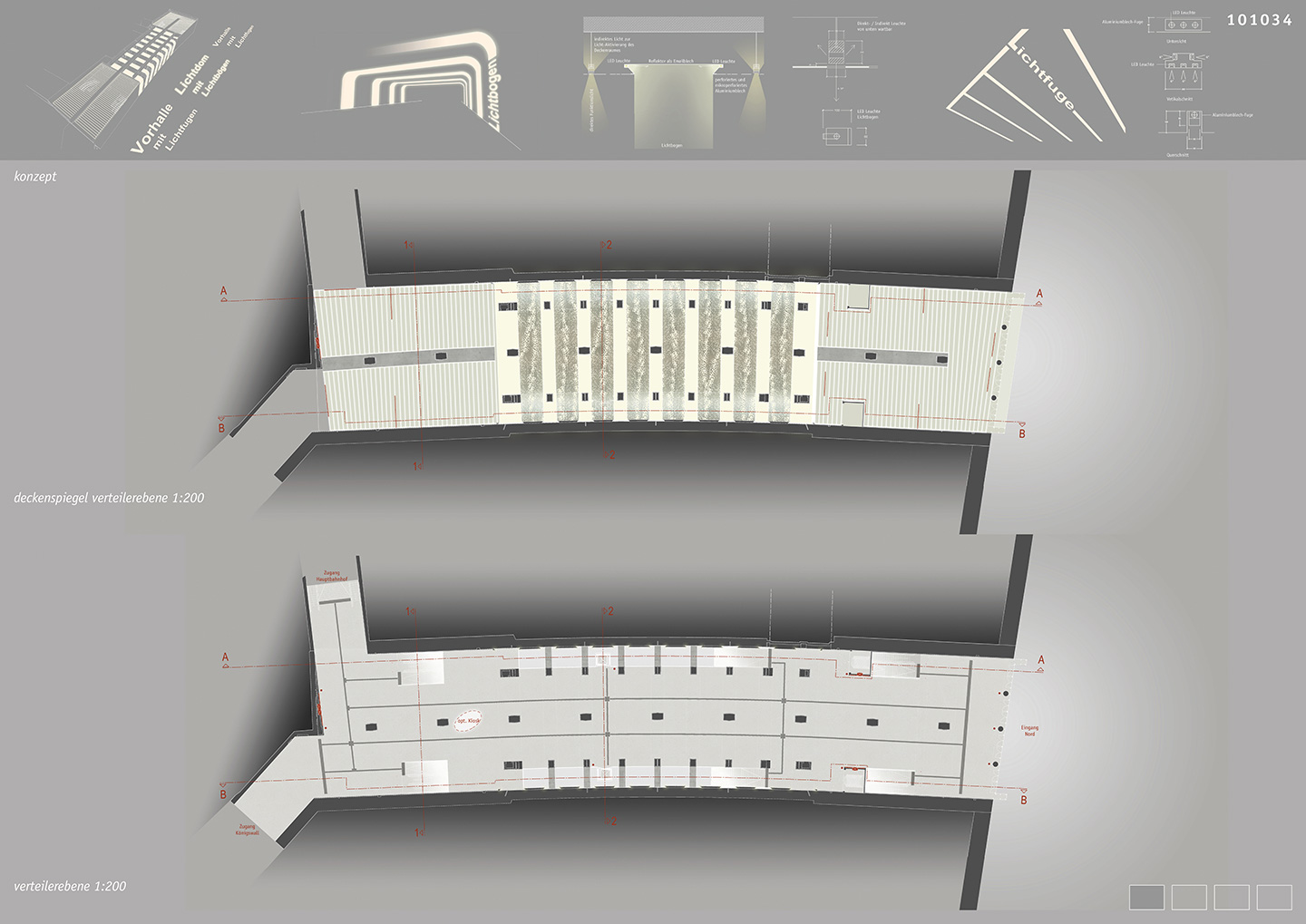 Es ist Ziel, eindeutige Raumzäsuren und damit einhergehend Prioritäten auszubilden. Die mit Eintritt in den Bahnhof bereits sichtbaren Lichtbögen des Lichtdoms führen den Fahrgast zu den Treppenanlagen und Aufzügen. Die Lichtbögen weisen - je nach Standort - den Blick von der Verteilerebene zur Fahrebene bzw. von der Fahrebene in die Höhe. Während die Decken der Vorhallen glatt und geschlossen mit in den vertieften Fugen integrierten Leuchten ausgebildet sind, werden die Deckenbereiche zwischen den Lichtbögen als perforierte Paneele vorgesehen: Lichtquellen oberhalb der perforierten Paneele durchleuchten die unterschiedlich großen Lochöffnungen zur Ausleuchtung der Verteilerebene und illuminieren gleichermaßen auch den Innenraum des abgehängten Bereiches.