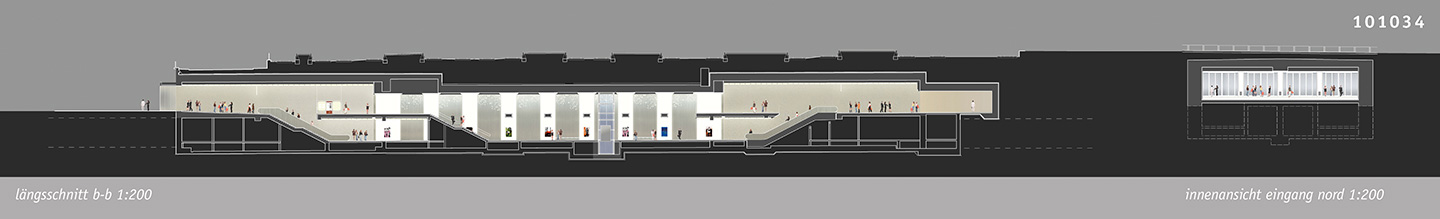 Aus den raumimmanenten Details, also der Zweigeschossigkeit im mittleren Bahnhofsbereich, mit Stützenreihen, mit Vouten im Übergang der Wand zur Decke und mit größerer Raumhöhe in der Mitte der Verteilerebene, leitet sich das architektonische Konzept ab: