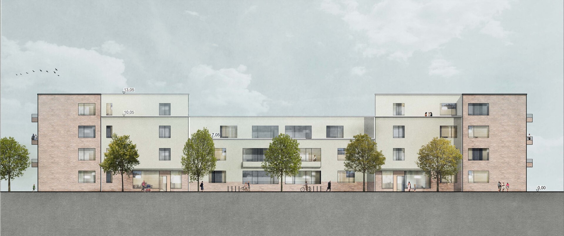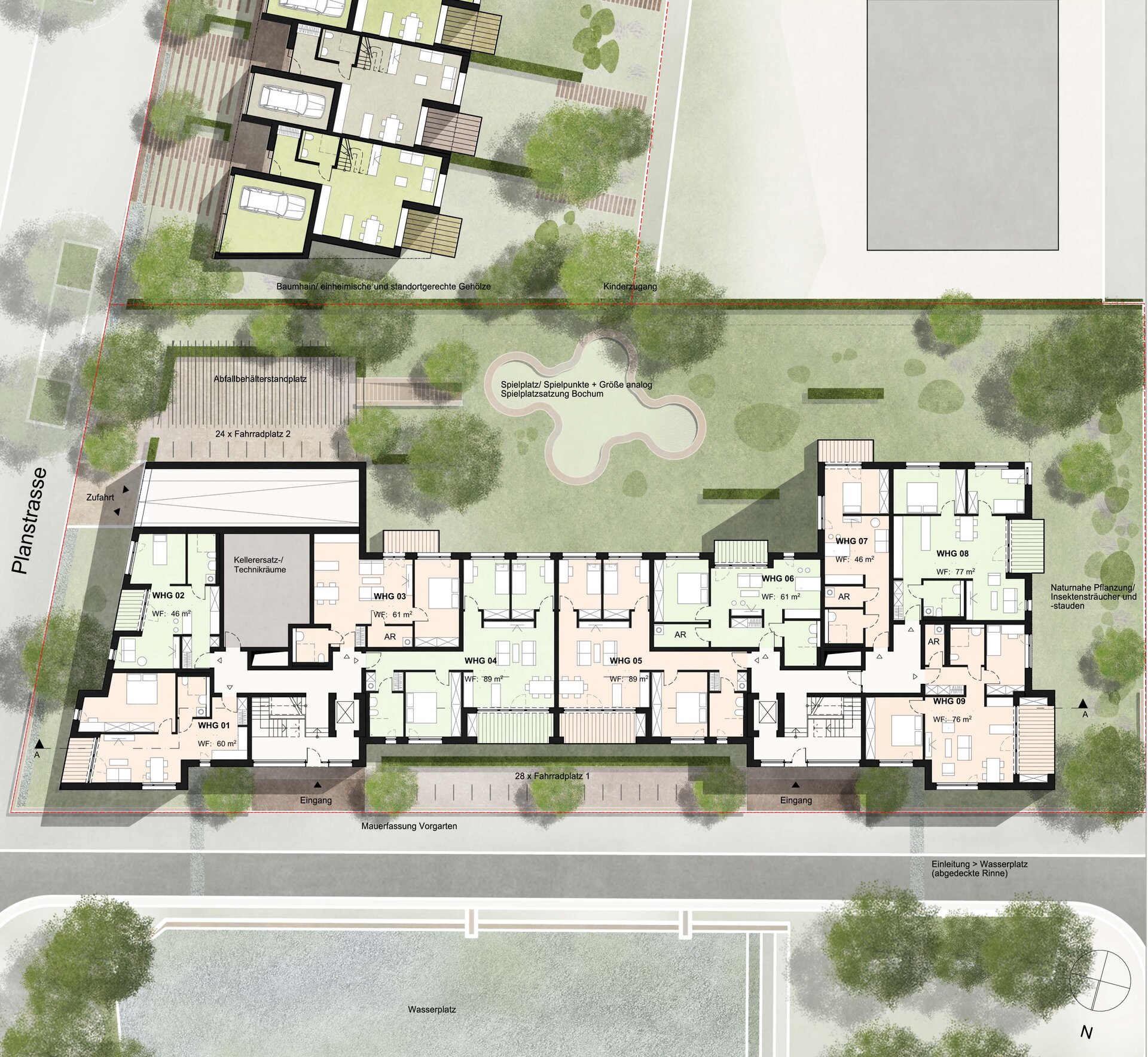OSTPARK – Neues Wohnen und hier das Quartier Feldmark bildet mit all seinen grundlegenden Ambitionen bzgl. zukunftsweisender Wohn-Stadt und Stadt-Landschaft den Rahmen für den vorliegenden Entwurf. Ein Mehrfamilienwohnhaus mit 33 Wohneinheiten sowie 10 Mietreihenhäuser entstehen im geförderten Wohnungsbau. Analog der Lage innerhalb des stark durch Grünstrukturen geprägten Gebiets sowie der besonderen Anforderungen an den Umgang mit Niederschlagswasser setzt das Gestaltungskonzept für den Freiraum auf einen Dreiklang von geringer Versiegelung der Nutzflächen, naturnaher Gestaltung von qualitätvollen Gemeinschaftsbereichen und Integration der oberflächlichen Ableitung der Niederschlagswässer und entwickelt daraus ein Geflecht vielgestaltiger Freiräume mit hoher Nutzbarkeit, Attraktivität und ökologischem Anspruch.